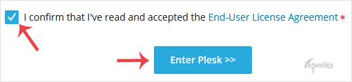 Final Step: Scroll down to the end of the page, read and accept the End-User License Agreement and then click on the Enter Plesk button.