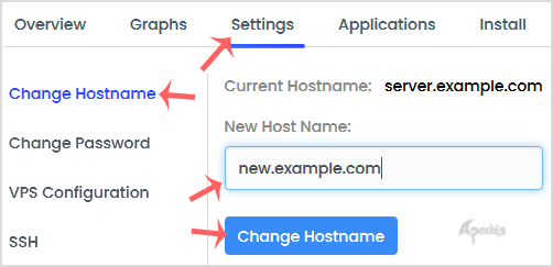 4. Click on the Settings tab, and under the Change Hostname option, enter your new hostname. Then click Change Hostname.